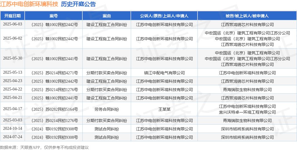 本站消息,根据天眼查APP显示,近日公布了一则江苏中电创新环境科技有限公司作为被告/被上诉人的开庭公告,详细内容如下: